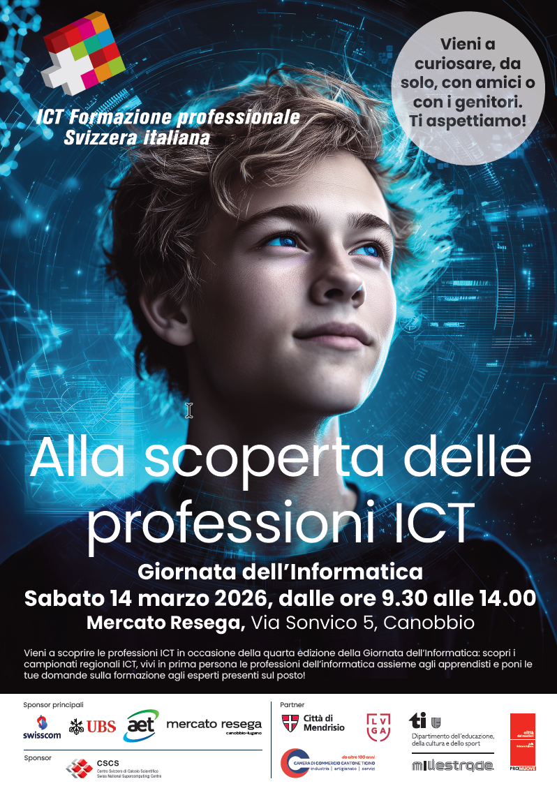 Vieni a scoprire le professioni ICT in occasione della quarta edizione della Giornata dell’Informatica: scopri i campionati regionali ICT, vivi in prima persona le professioni dell’informatica assieme agli apprendisti e poni le tue domande sulla formazioni agli esperti presenti sul posto!